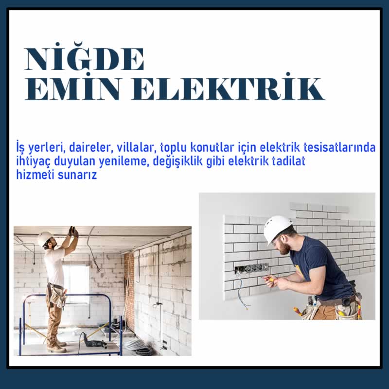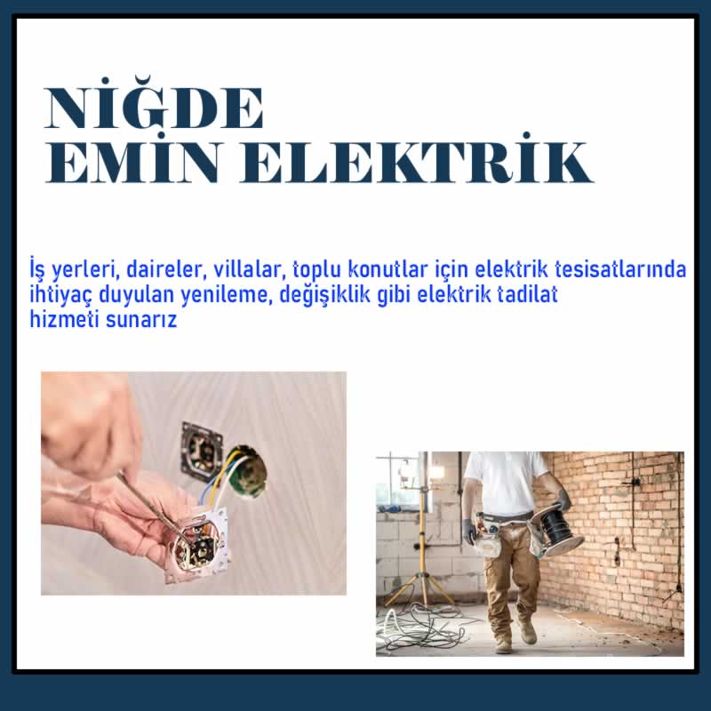 Niğde Emin Elektrik On yılı aşkın süredir ev ve iş yerlerinde elektrik sistemleri üzerine hizmet veren firmamız sektörün öncü kuruluşları arasındadır. Firmamızın en önemli misyonu müşteri memnuniyetidir. Bizleri tercih eden müşterilerimizin güvenliğini en iyi şekilde sağlayarak rahat hareket etme imkanı sunmaktayız. Gerek ürün kalitesi, gerek fiyat politikası, gerekse de uygun ödeme imkanlarıyla tercihiniz olmayı arzuluyoruz.